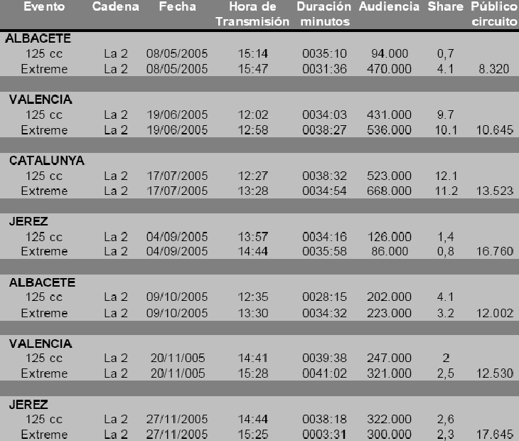 DORNA SPORTS y empresas especializadas sobre estudios de audiencias durante la pasada temporada 2005.